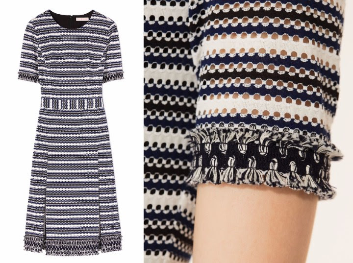 The updated $395 Paulina dress in Navy/Black/White Jamaica Dot features a crewneck, full pleated skirt, banded waist and tassel trim at sleeves and hem. It's described: "Classic meets eclectic on one of our best-selling styles from seasons past. The Paulina Dress is a revival of a ladylike silhouette, pointelle-knit in graphic black and white, and detailed with fringe. The optical contrast, fitted waist and pleated skirt create a figure-enhancing effect." It's available on the USA website (not on the UK yet) in sizes XS - XL.
